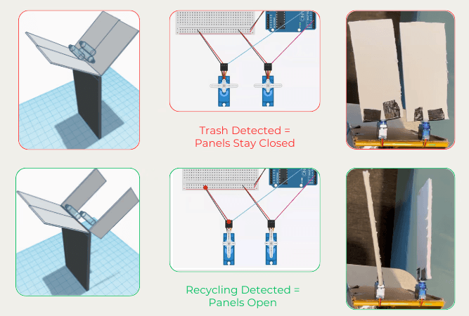 We successfully developed a functional MVP using an Arduino circuit, servo motors, and an object detection algorithm with ml5.js. The system utilizes a computer's camera to identify whether an item is recyclable or waste. Once classified, the Ecosorter opens the corresponding door using servo motors to automatically sort the item.
