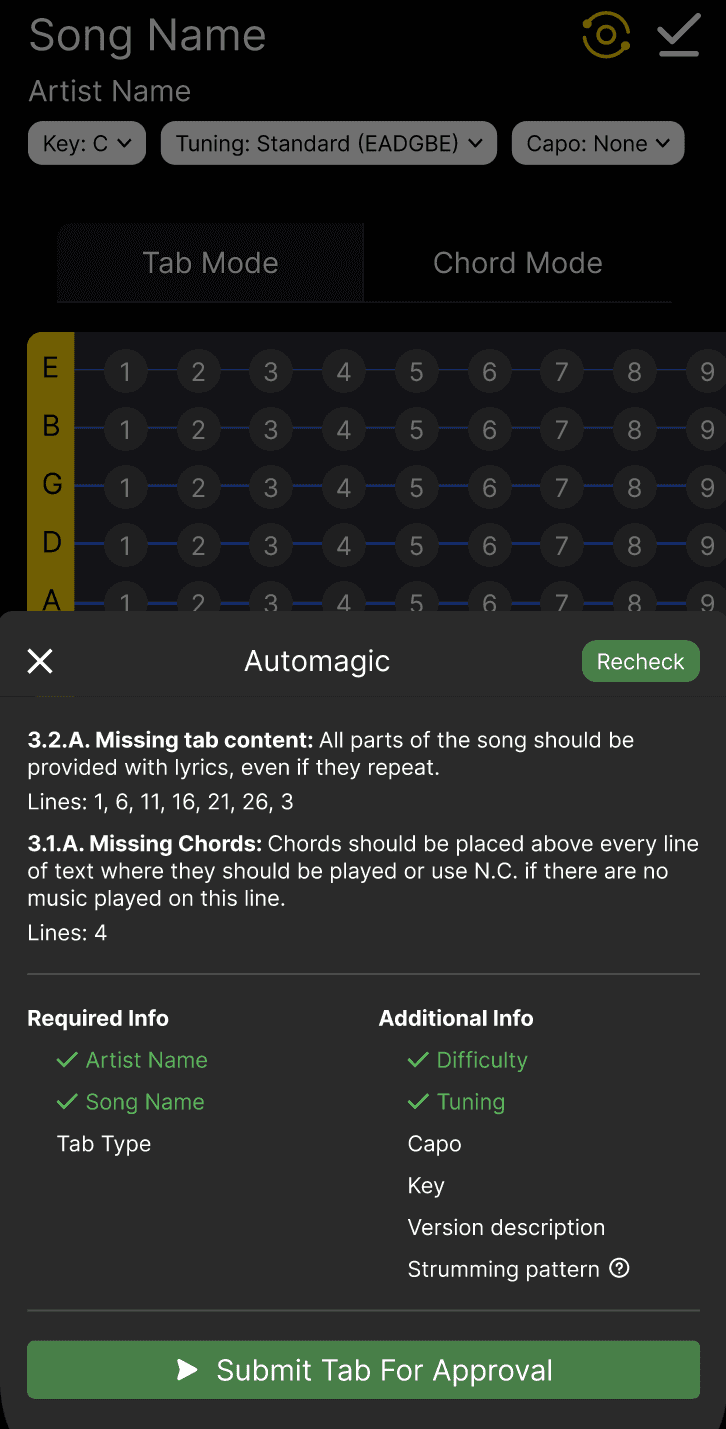 Submitting tabs requires following detailed formatting guidelines.